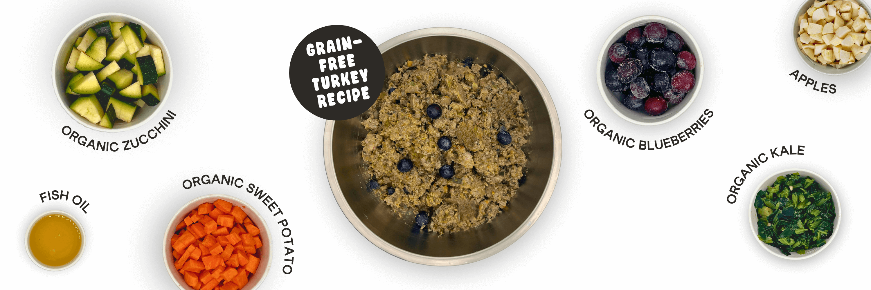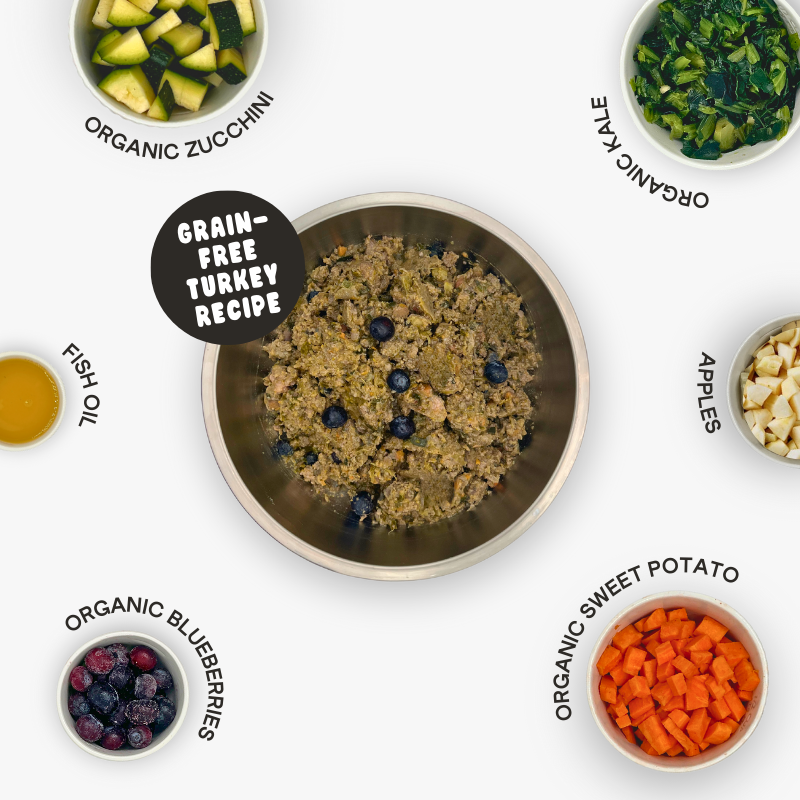 This high-protein recipe is made from USA-raised, USDA-inspected turkey. The recipe is grain-free, and made up of about 65% turkey and about 35% vegetables. 98% of the non-meat ingredients in our recipes are USDA Certified Organic. This is important, because non-organic vegetables are sprayed with carcinogenic pesticides, and studies have shown that their residues often end up in dog food. Like all of our recipes, this one is complete and balanced for all life stages. It was designed by a PhD vet nutritionist, and contains no preservatives, wheat, corn or soy.