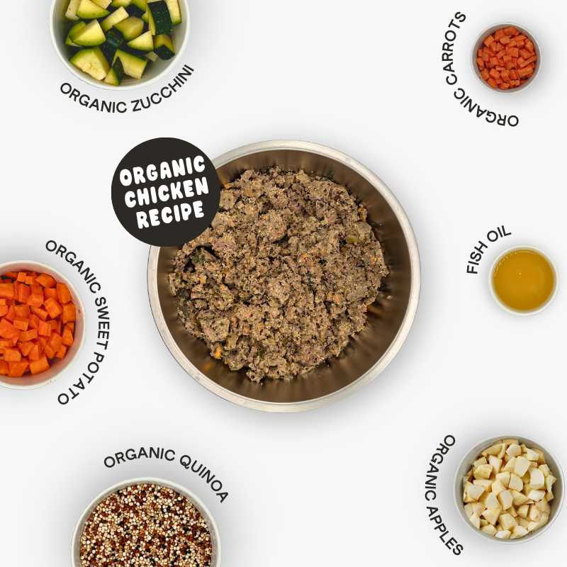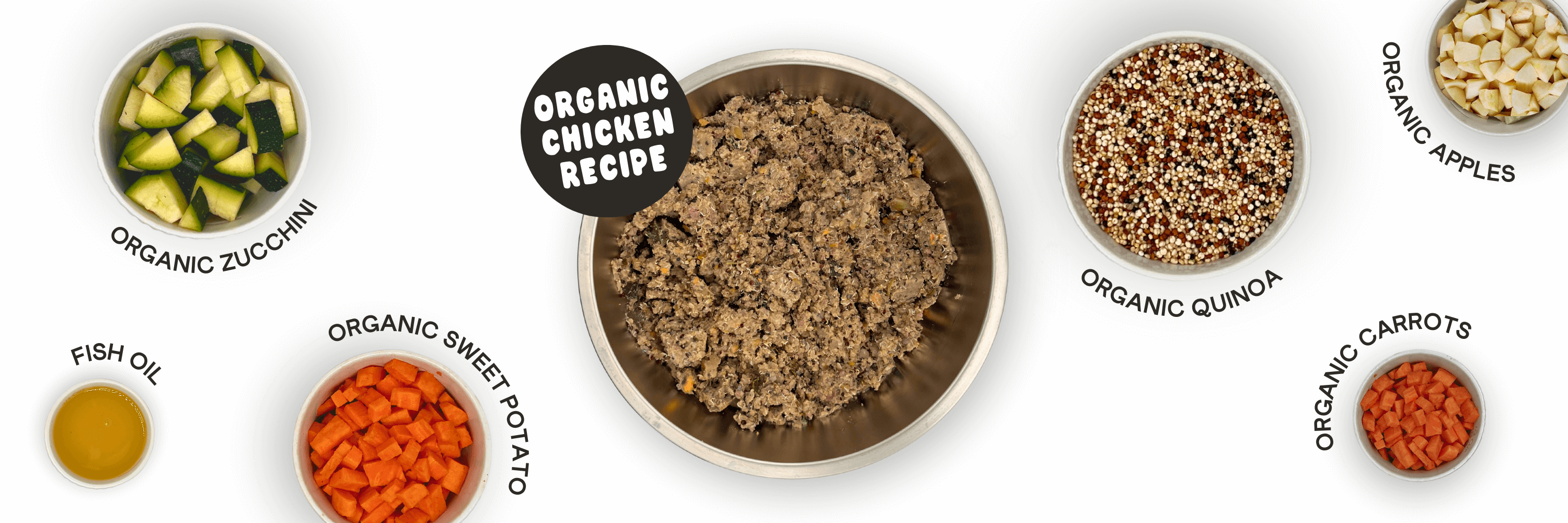 Humanely raised organic chicken, organic quinoa, organic vegetables, fish oil, minimal supplement
