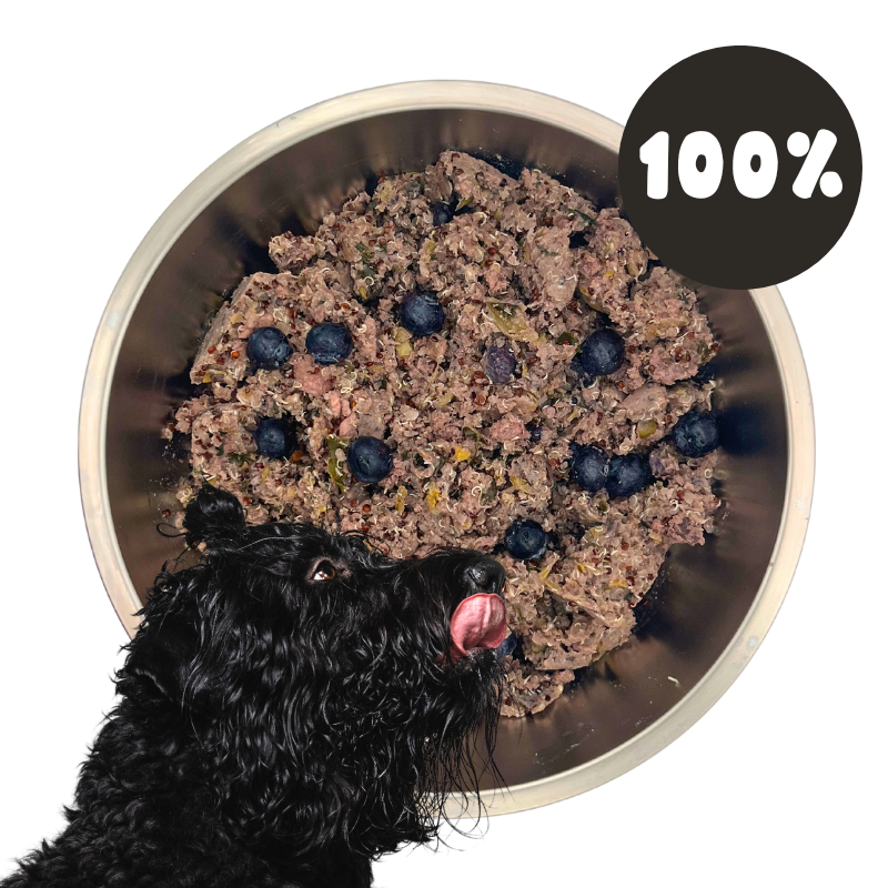 Fresh, gently-cooked dog food. Made from wild-hunted venison, organic quinoa and organic vegetables. Complete and balanced. Arrives in bags of frozen cubes. Just defrost and serve.